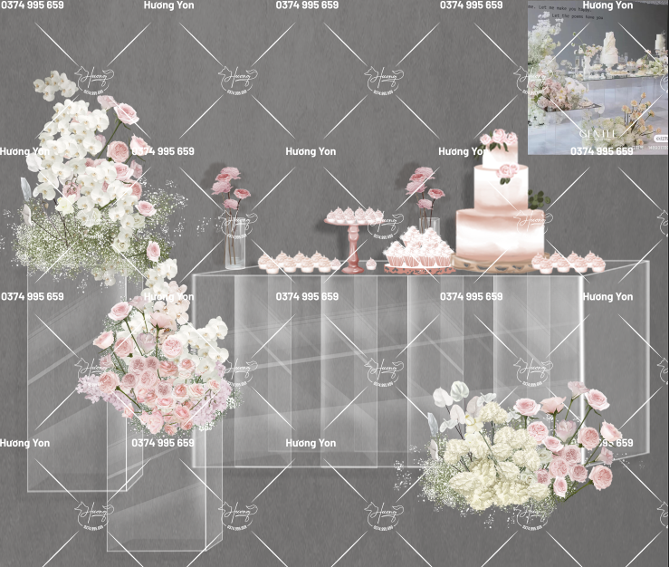 mô tả sẵn bàn tiệc bánh tone hồng trong suốt